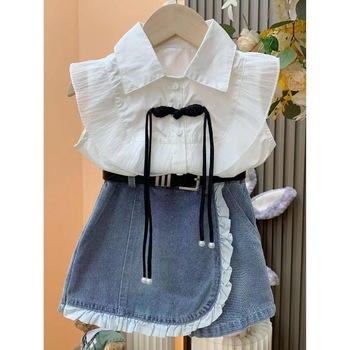 2025 mùa hè cô gái 'công chúa phong cách giản dị thiết lập mới bé gái rung tay áo sơ mi denim ren váy quần rắn hai mảnh thiết lập